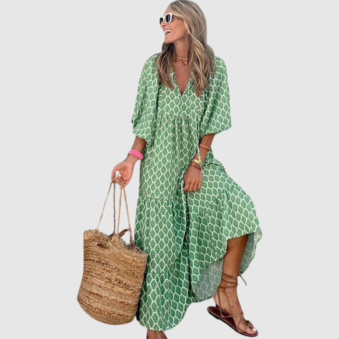 Barbara | Dames Maxi Jurk | Groene V-hals Strandjurk met Pofmouw