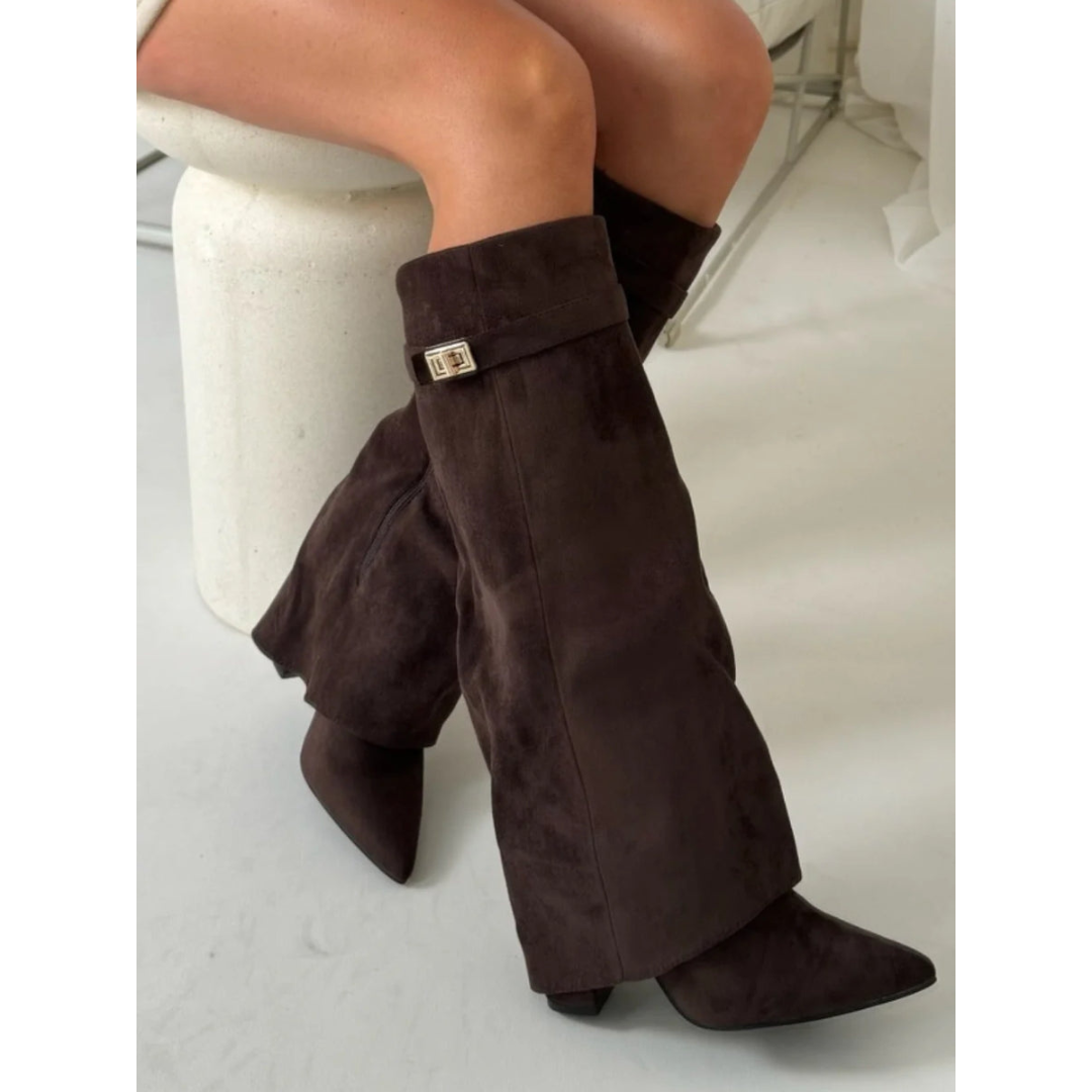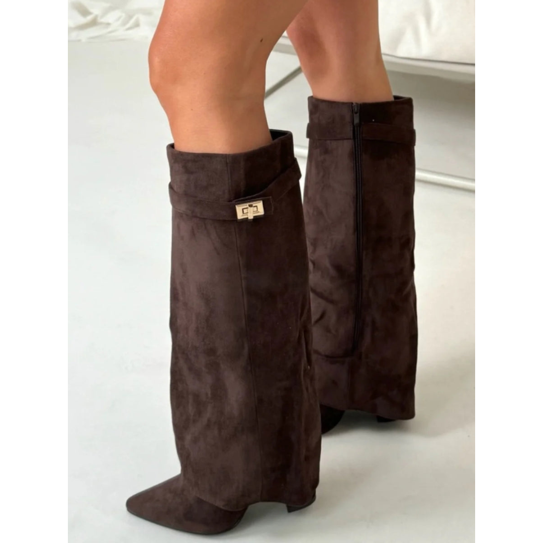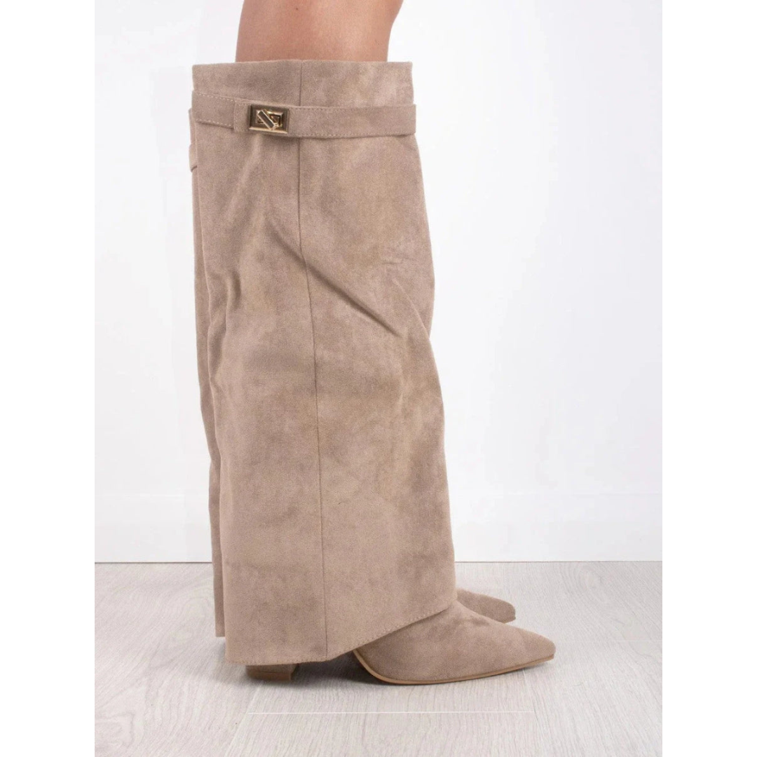 Sarah | Dames Laarzen van Suède Met Flaire Pasvorm En Gouden Details | Hoge Hak en Ritssluiting